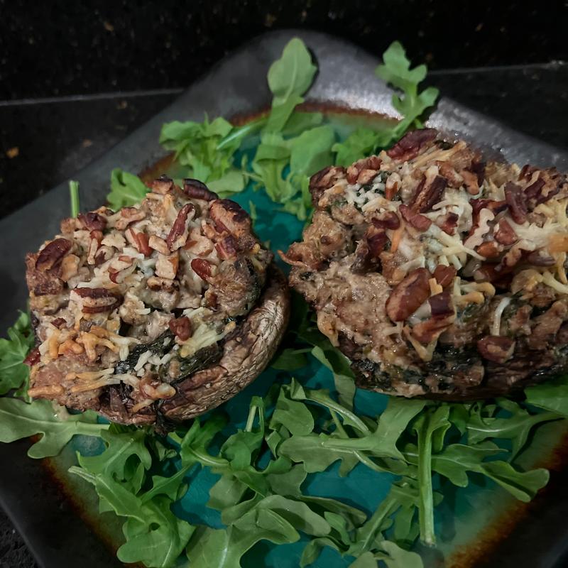 Portabella caps, fresh Italian sausage, cream cheese, fresh veggies, herbs and spices, baked to perfection - topped with pecans and Parmesan cheese.