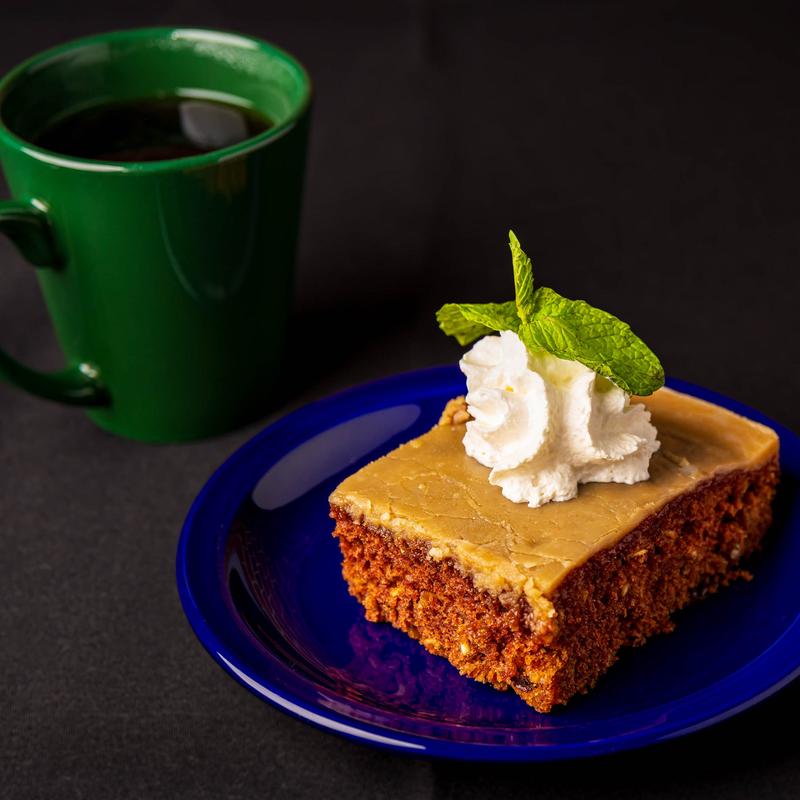 Dive into a delightful slice of heaven! Indulge in this rich and moist oatmeal cake, bursting with juicy raisins, and topped with a luscious brown sugar glaze. Made right here in-house, it's a sweet treat that's sure to satisfy!