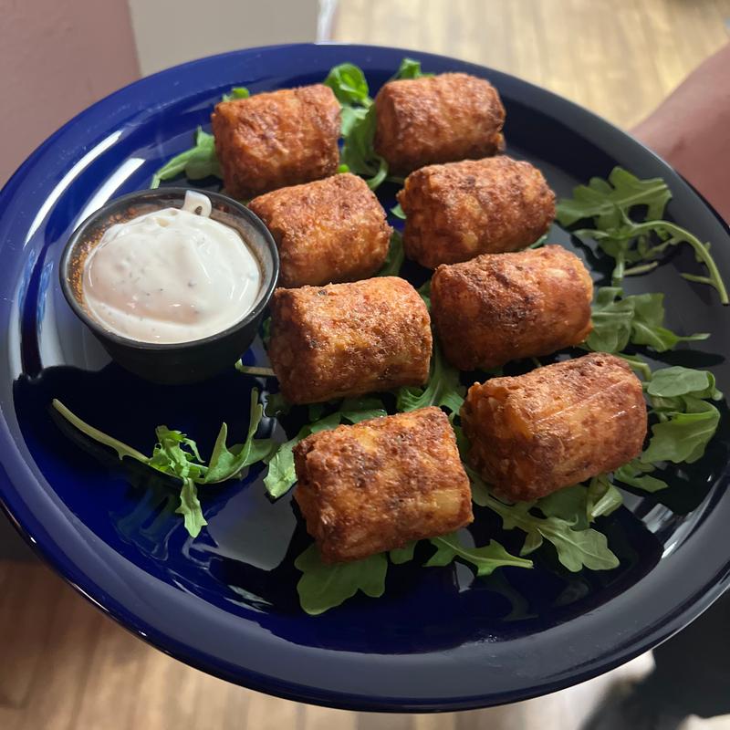 Eight - Lumberjack-sized Tator Tots- packed full of cream cheese, jalapenos, bacon, and more. Served with Woodsmen's own ranch dressing, this rustic take on the classic side item is a staff favorite.